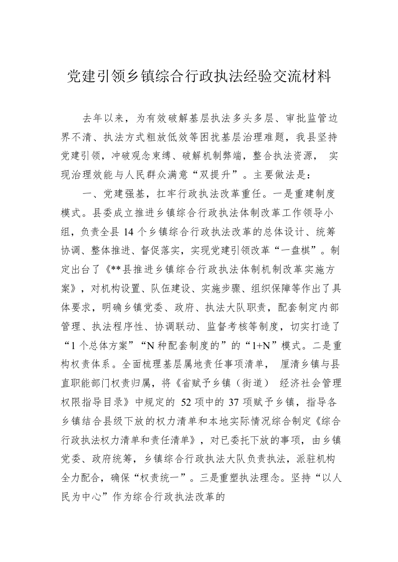 / 党建引领乡镇综合行政执法经验交流材料