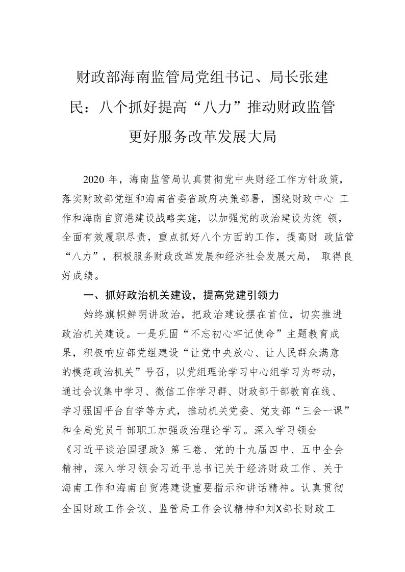 / 财政部海南监管局党组书记、局长张建民:八个抓好提高“八力”推动财政监管更好服务改革发展大局