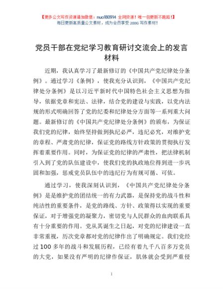 / 党员干部在党纪学习教育研讨交流会上的发言材料1