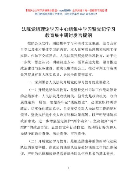 / 法院党组理论学习中心组集中学习暨党纪学习教育集中研讨发言提纲1