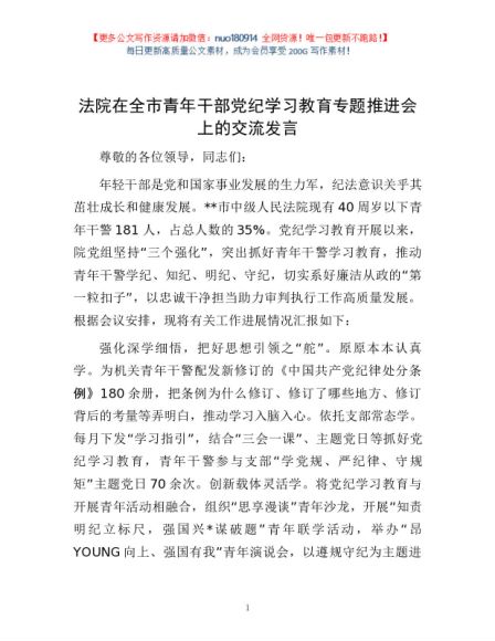 / 法院在全市青年干部党纪学习教育专题推进会上的交流发言1