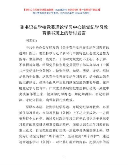 / 副书记在学校党委理论学习中心组党纪学习教育读书班上的研讨发言1
