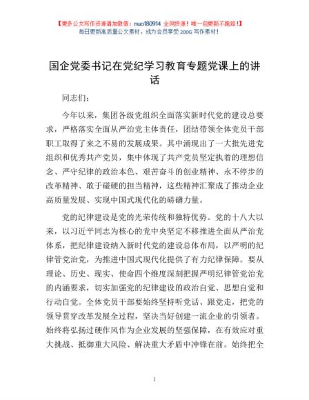 / 国企党委书记在党纪学习教育专题党课上的讲话1