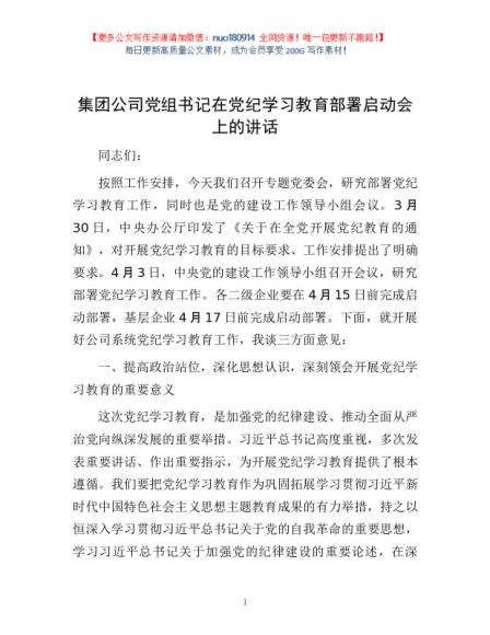 / 集团公司党组书记在党纪学习教育部署启动会上的讲话1