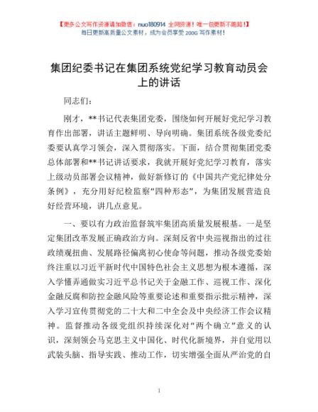 / 集团纪委书记在集团系统党纪学习教育动员会上的讲话1