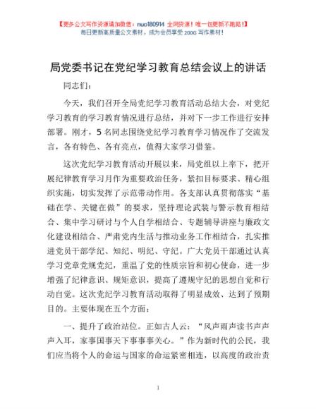 / 局党委书记在党纪学习教育总结会议上的讲话1
