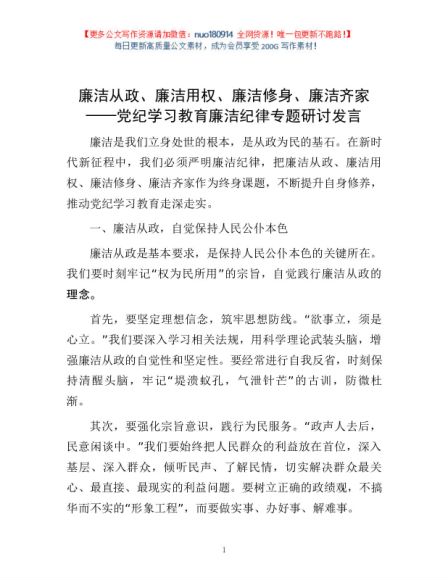 廉洁从政、廉洁用权、廉洁修身、廉洁齐家——党纪学习教育廉洁纪律专题研讨发言1