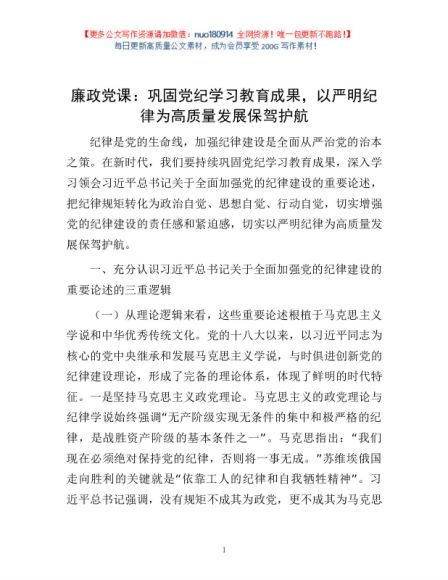 / 廉政党课:巩固党纪学习教育成果,以严明纪律为高质量发展保驾护航1