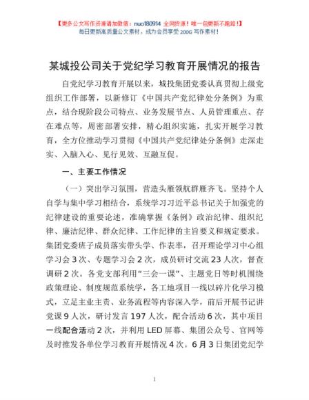 / 某城投公司关于党纪学习教育开展情况的报告1