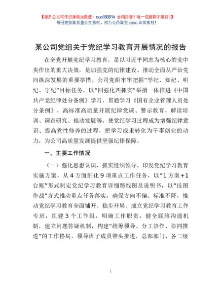 / 某公司党组关于党纪学习教育开展情况的报告1