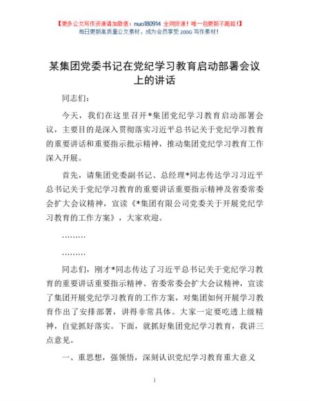 / 某集团党委书记在党纪学习教育启动部署会议上的讲话1