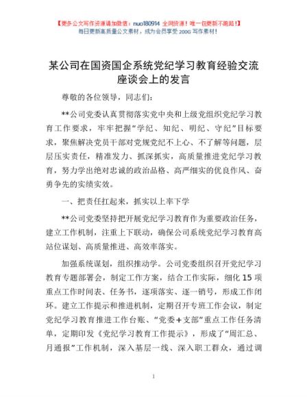 / 某公司在国资国企系统党纪学习教育经验交流座谈会上的发言1