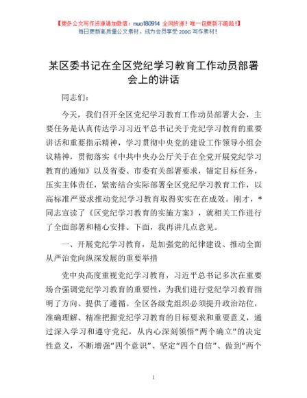 / 某区委书记在全区党纪学习教育工作动员部署会上的讲话1