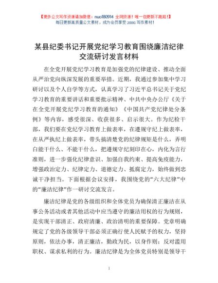 / 某县纪委书记开展党纪学习教育围绕廉洁纪律交流研讨发言材料1