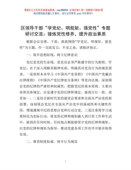 区领导干部“学党纪、明规矩、强党性”专题研讨交流:锤炼党性修养,提升政治素质1
