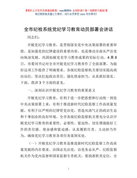 / 全市纪检系统党纪学习教育动员部署会讲话1