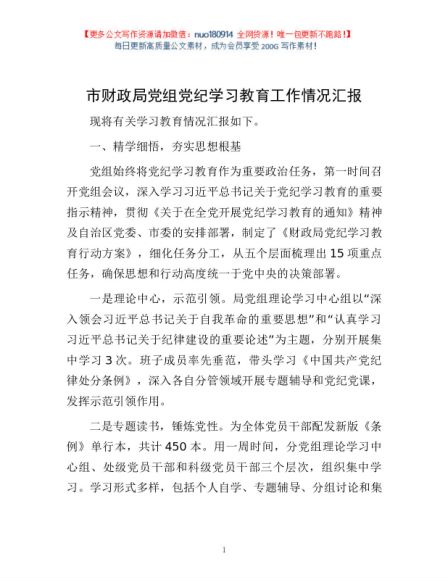 市财政局党组党纪学习教育工作情况汇报1