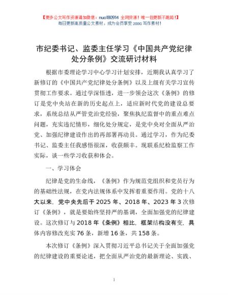 / 市纪委书记、监委主任学习《中国共产党纪律处分条例》交流研讨材料1