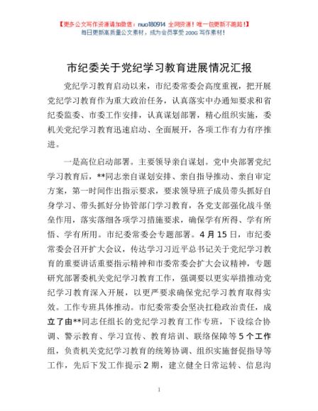 / 市纪委关于党纪学习教育进展情况汇报1