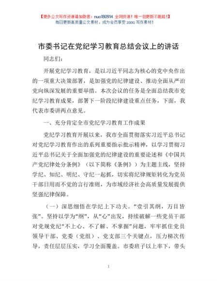 / 市委书记在党纪学习教育总结会议上的讲话1