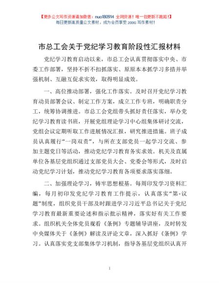 市总工会关于党纪学习教育阶段性汇报材料1