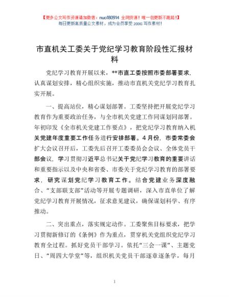 / 市直机关工委关于党纪学习教育阶段性汇报材料1