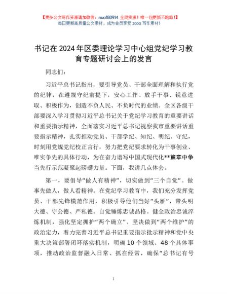 / 书记在2024年区委理论学习中心组党纪学习教育专题研讨会上的发言1