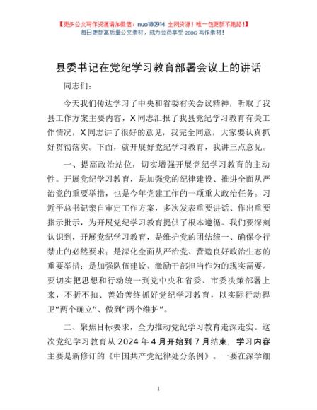 / 县委书记在党纪学习教育部署会议上的讲话1