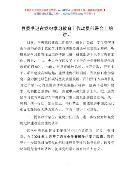 / 县委书记在党纪学习教育工作动员部署会上的讲话1