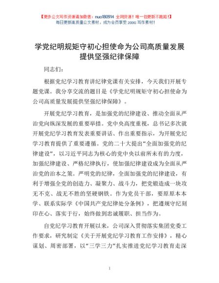 / 学党纪 明规矩 守初心 担使命 为公司高质量发展提供坚强纪律保障1