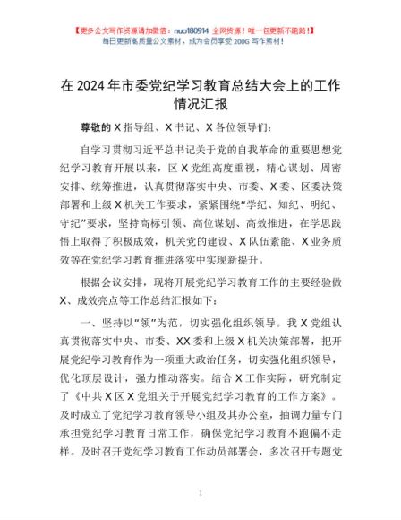 / 在2024年市委党纪学习教育总结大会上的工作情况汇报1