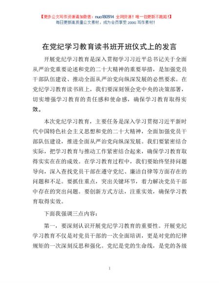 / 在党纪学习教育读书班开班仪式上的发言1