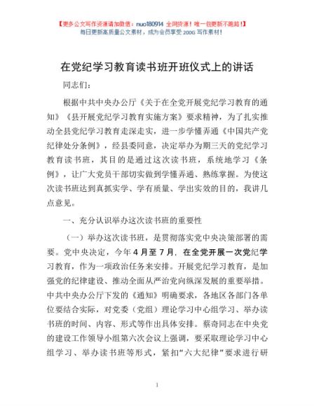 / 在党纪学习教育读书班开班仪式上的讲话1