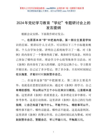 / 2024年党纪学习教育“学纪”专题研讨会上的发言提纲1