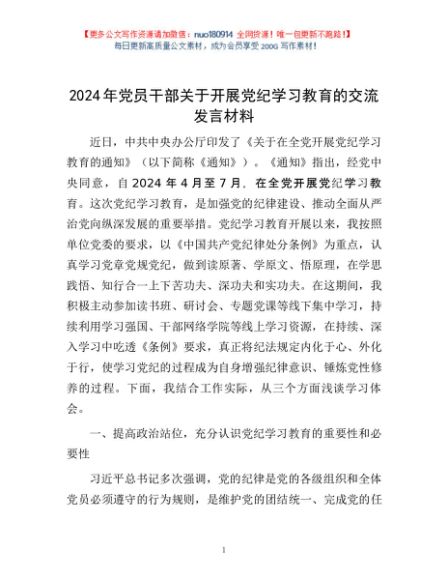 / 2024年党员干部关于开展党纪学习教育的交流发言材料1