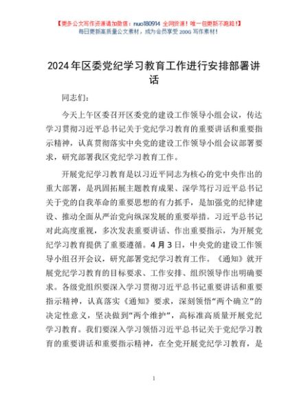 / 2024年区委党纪学习教育工作进行安排部署讲话1