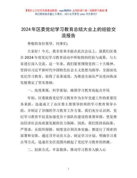 / 2024年区委党纪学习教育总结大会上的经验交流报告1