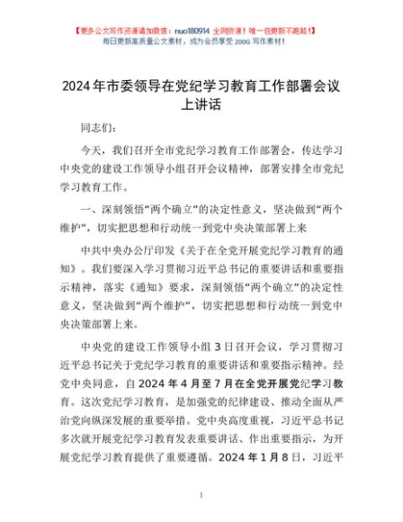 / 2024年市委领导在党纪学习教育工作部署会议上讲话1