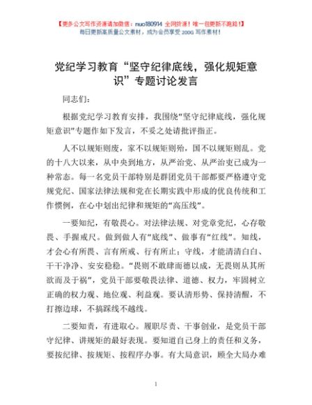 / 党纪学习教育“坚守纪律底线,强化规矩意识”专题讨论发言1