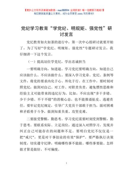 / 党纪学习教育“学党纪、明规矩、强党性”研讨发言1