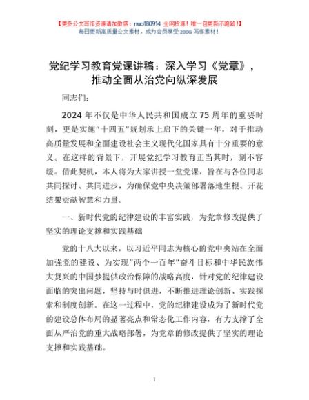 / 党纪学习教育党课讲稿:深入学习《党章》,推动全面从治党向纵深发展1
