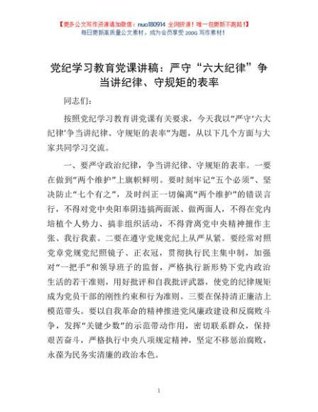 / 党纪学习教育党课讲稿:严守“六大纪律” 争当讲纪律、守规矩的表率1