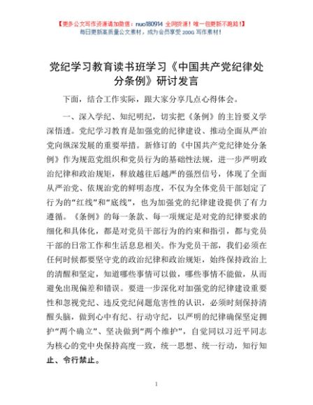 / 党纪学习教育读书班学习《中国共产党纪律处分条例》研讨发言1