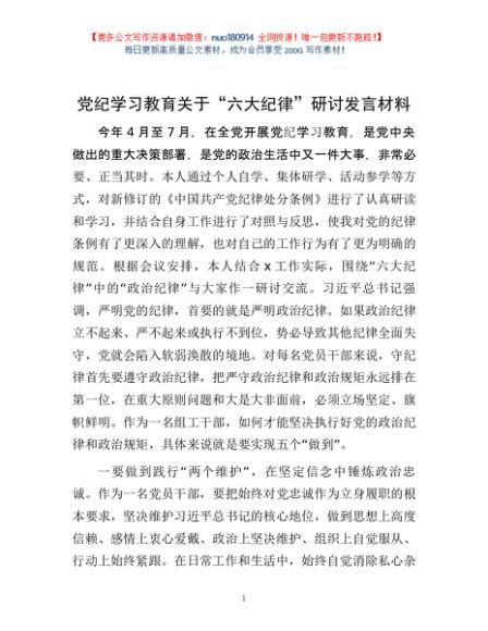/ 党纪学习教育关于“六大纪律”研讨发言材料1