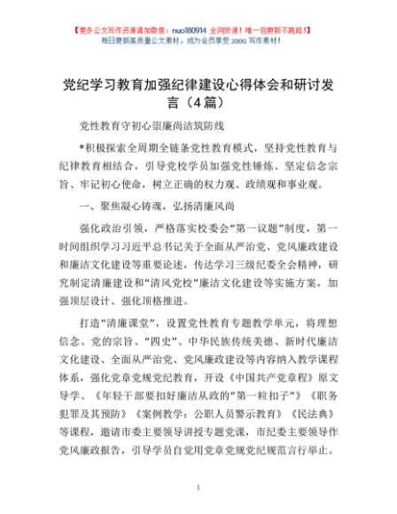/ 党纪学习教育加强纪律建设心得体会和研讨发言(4篇)1