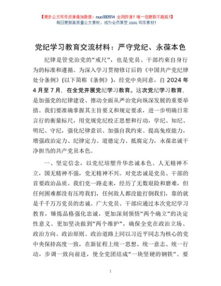 / 党纪学习教育交流材料:严守党纪、永葆本色1