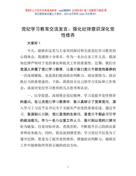/ 党纪学习教育交流发言:强化纪律意识 深化党性修养1