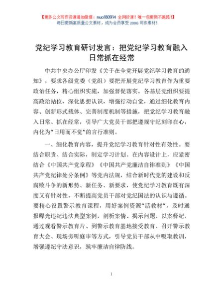 / 党纪学习教育研讨发言:把党纪学习教育融入日常抓在经常1