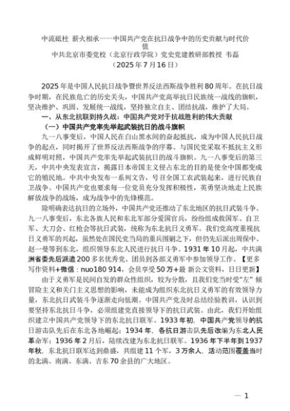 “党课荟”系列第367期韦磊:中流砥柱 薪火相承——中国共产党在抗日战争中的历史贡献与时代价值