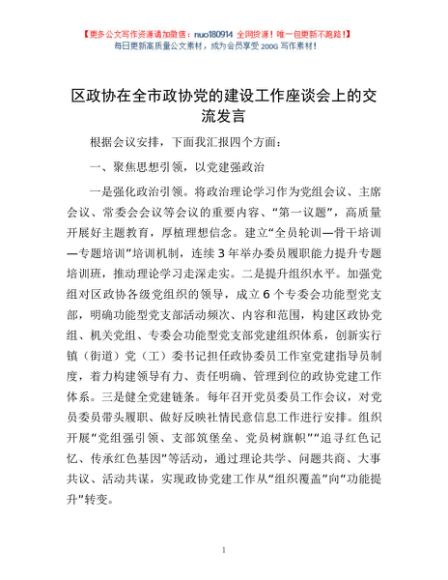 / 区政协在全市政协党的建设工作座谈会上的交流发言